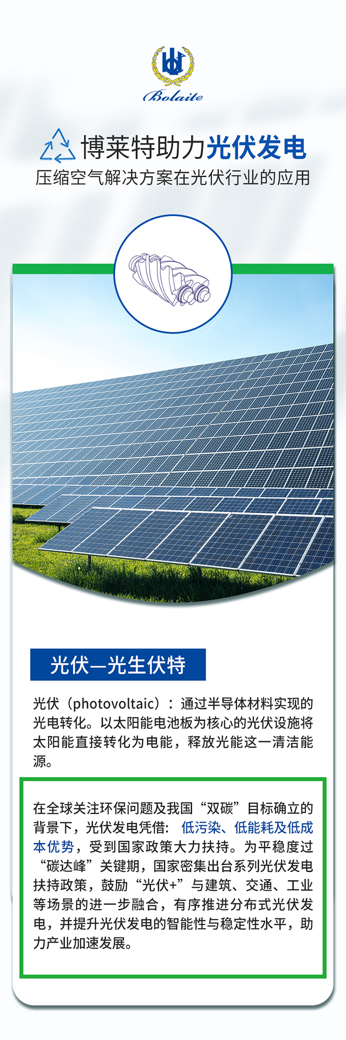 在加速推进“碳达峰、碳中和”的浪潮下,光伏产业成为实现双碳目标的中坚力量之一。博莱特作为阿特拉斯·科普柯集团成员,我们遵循集团的减少温室气体排放的科学减碳目标,科学减碳目标涵盖了公司的整个价值链。