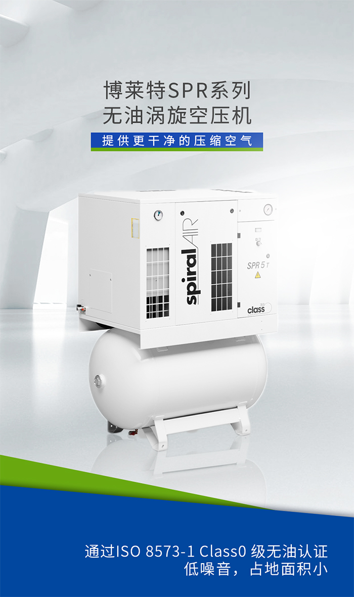 博莱特SPR系列无油涡旋空压机:通过动盘围绕静盘基圆中心做很小半径的平面转动实现空气压缩的,因为两个涡盘互不接触,压缩腔内无需任何润滑油,因此可确保压缩空气达到Class 0级无油标准。