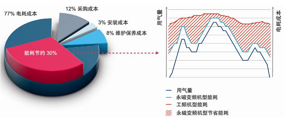 ● 在空压机的使用寿命周期中,总成本由采购、安装、维护和能耗4部分组成。每台空压机在其寿命周期内的能耗成本将占到总成本的70%左右,而初期购买空压机的投资成本只有12%左右