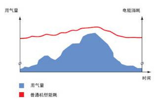 ● 在用气负荷高时压缩机加载,负荷低时压缩机卸载,由于存在空气需求量的波动,压缩机有较长时间处于卸载状态,导致能源的浪费