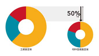 QSV 系列真空泵相比其它技术,消耗的能源仅是它们的 50% 左右。在同等流量范围,QSV 真空泵是市场上最高效的油润滑式真空泵之一。其它技术与 QSV 系列相比(例如:油封式旋片泵),则显得效率低、成本高(尤其在抽速>300m3/h)。